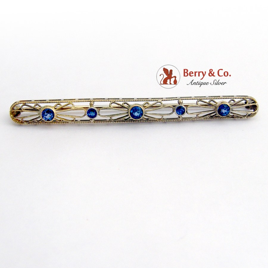 Vintage Ornate Open Work Bar Pin Brooch 14 K White Gold Sapphires