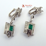 Art Deco Natural Emerald Earrings Diamonds 14 K White Gold.