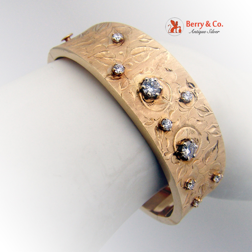 Vintage Wide Bold Bangle Bracelet 14 K Gold 1 TCW Diamonds