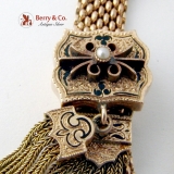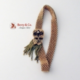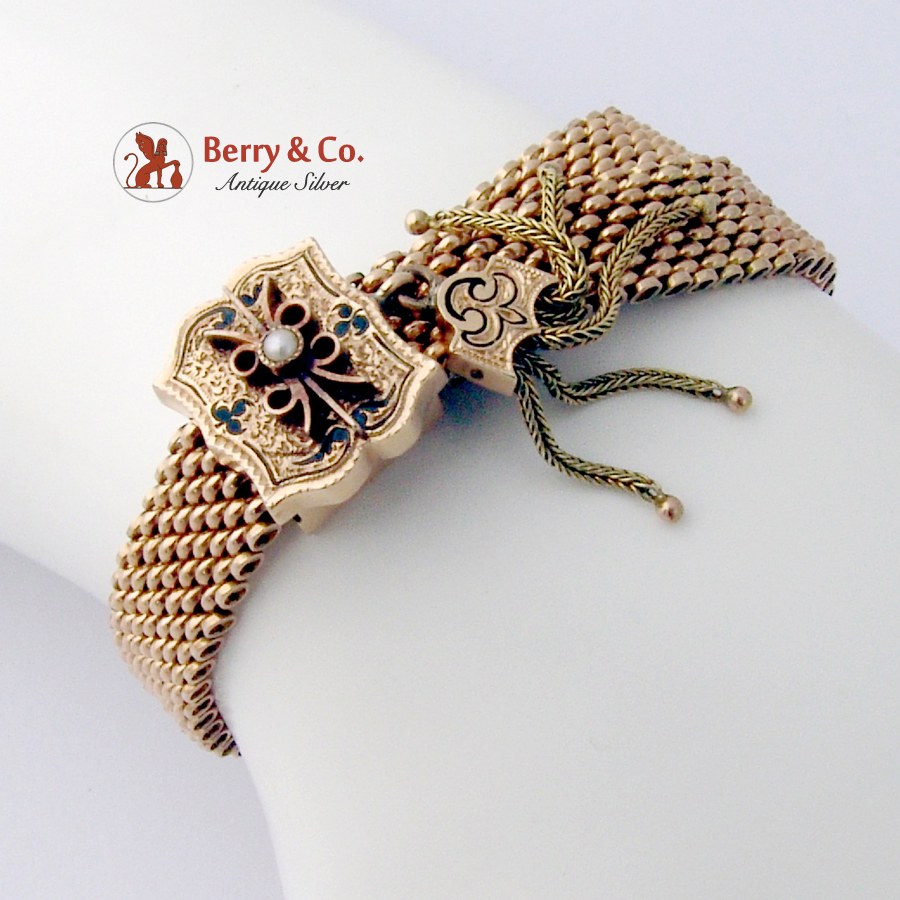 This is quite substantial and made from heavy weight flexible gold mesh. The embellished gold slide has lovely seed pearl with attached tassels. Bracelet features gold tassel embellishment also on the end of the bracelet and black enamel to accent the gold. There is one tassle missing.