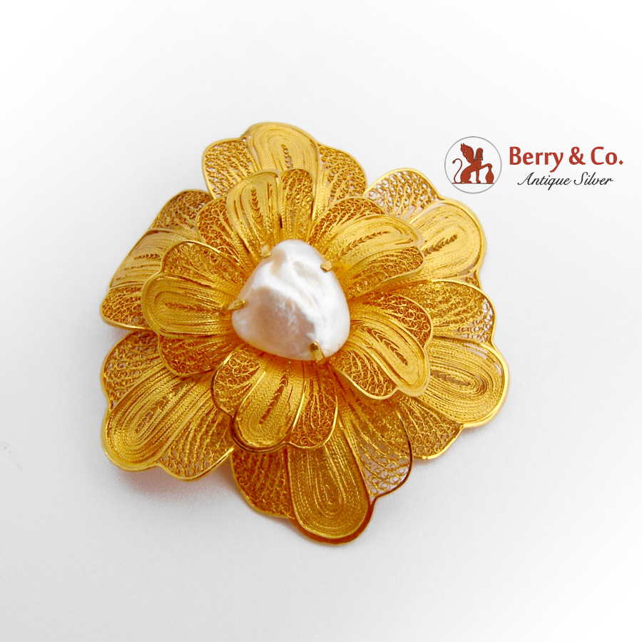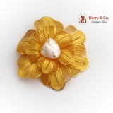 Stunning Filigree Flower Brooch Baroque Pearl 23K Yellow Gold