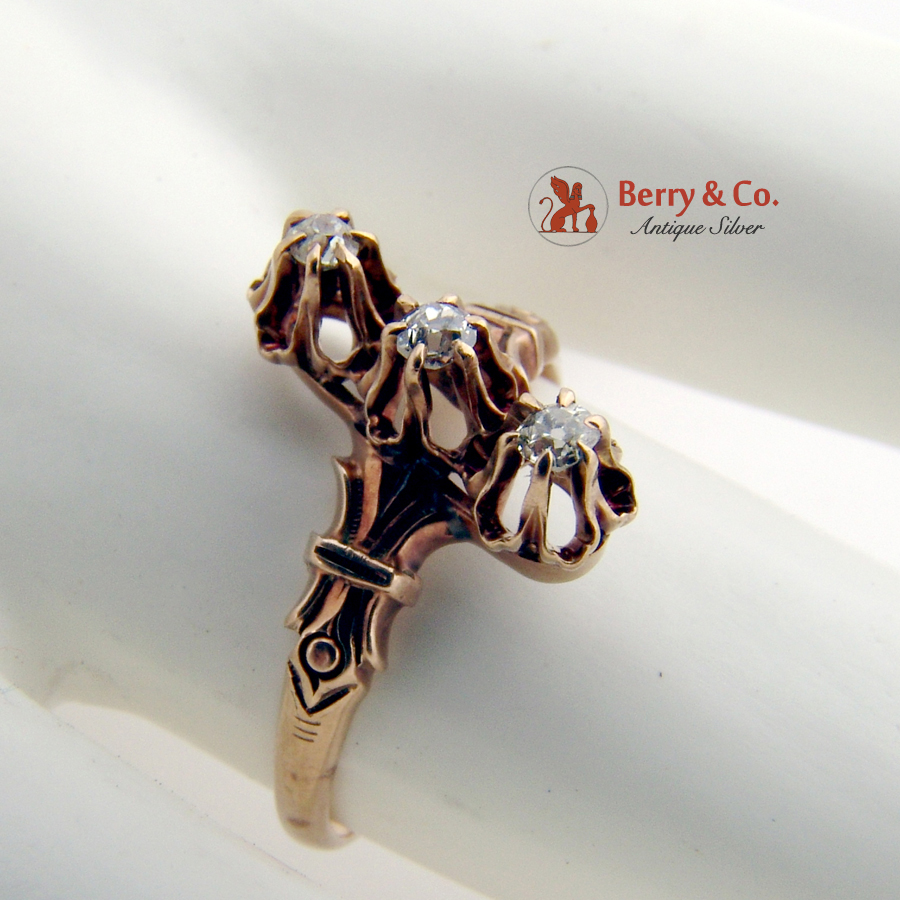 Antique Ornate Long Triple Diamond Ring Yellow Gold 1880