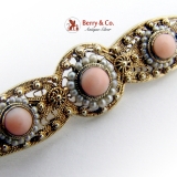 Art Nouveau Long Filigree Brooch Pink Coral Seed Pearls 14K Gold