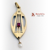 Art Deco Intricate Openwork Design Pendant Synthetic Ruby & Diamond Chip Accent, Seed Pearl Dangle 14K (.585) Gold.