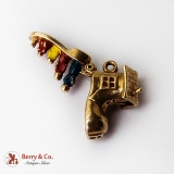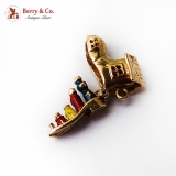 Vintage yellow gold charm in form of a fantasy shoe house with movable bottom, that features 4 figures of a family, with blue, red & yellow enamel decorations.