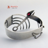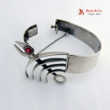 The bracelet has an inner circumference of 5 3/4" and its width varies between 1 7/8" in the front and 3/8" where the second "wing" meets the skeleton on the side. It weighs 43 grams and is signed LC. Excellent vintage condition.