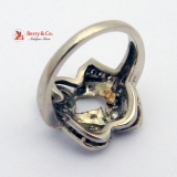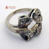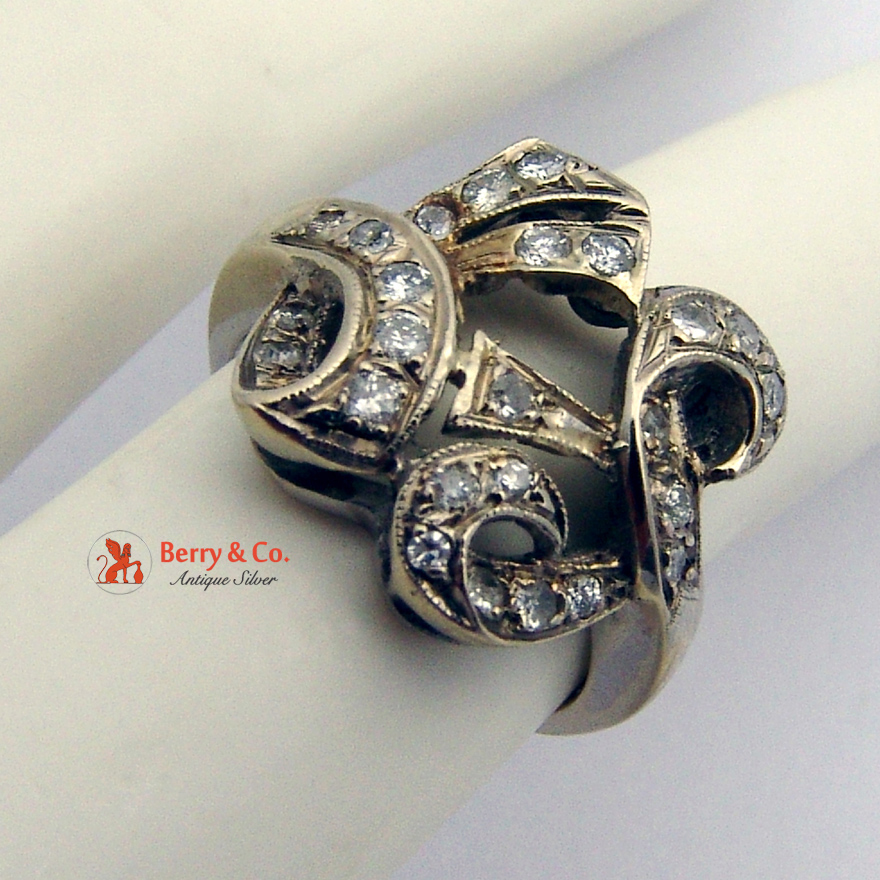 This beautiful ring is size 6 3/4, it weighs 5.2 grams or 3.3 dwt. There are 25 tiny diamonds, aprox. .6 TCW.