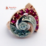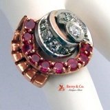 Retro Cocktail Ring Rose and White Gold 14 K Diamonds Rubies