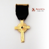 Knights Templar 14K gold cross with inlay red guilloche enamel and Onyx decorations and white Sapphire accent. California, c. 1954