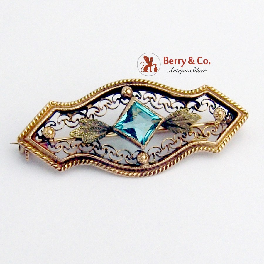 Vintage Brooch 10 K Gold Light Blue Glass Gem