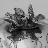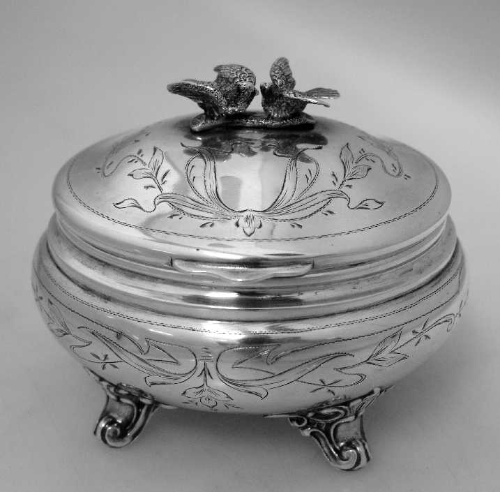 Austrian 800 silver sugar box with engraved decorations on the body and lid, c.1890 - 1910. With the lid being adorned by two cast birds sitting on a branch. The birds are attached to the lid by two silver nuts securing the studs. The body sits on four nicely decorated cast scroll feet.